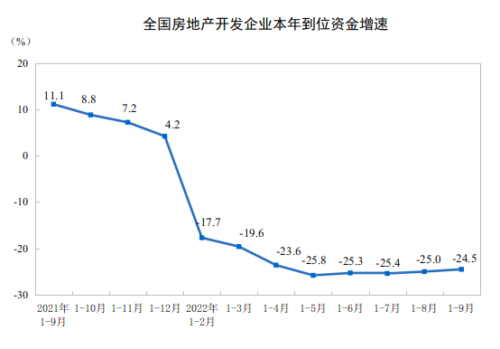 1—9月份,房地產(chǎn)開發(fā)企業(yè)到位資金114298億元,同比下降24.5%。其中,國內(nèi)貸款13661億元,下降27.2%;利用外資61億元,增長2.7%;自籌資金40568億元,下降14.1%;定金及預(yù)收款37348億元,下降34.1%;個人按揭貸款18397億元,下降23.7%。