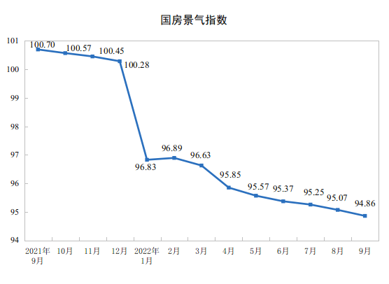 9月份,房地產(chǎn)開發(fā)景氣指數(shù)(簡稱“國房景氣指數(shù)”)為94.86。
