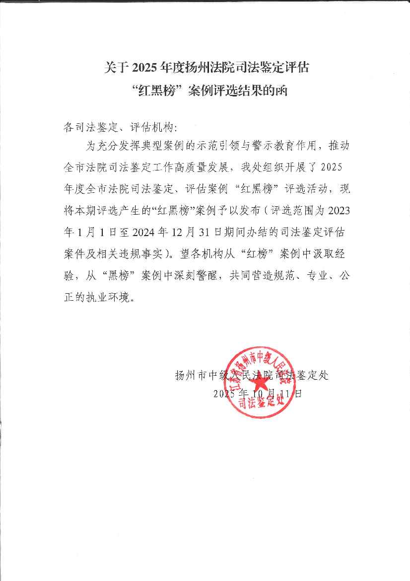 關于2025年度揚州法院司法鑒定評估“紅黑榜”案例評選結果的函